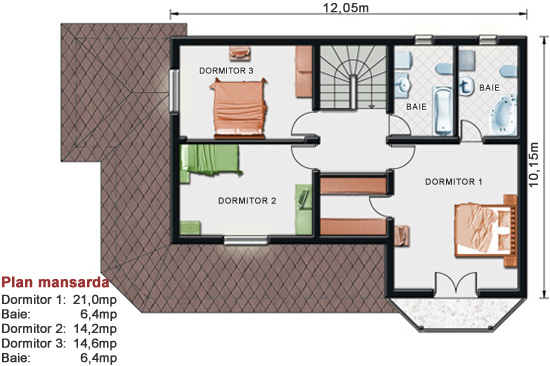 La nivelul superior se găsesc trei camere largi ce asigură spațiul necesar odihnei pentru o familie de patru sau cinci persoane. Dormitorul matrimonial își manifestă primatul prin intermediul suprafeței mari de 21 mp, având atașat o baie spațioasă de 6,4 mp,un dressing amplu, precum și o deschidere directă către exterior printr-o terasă exprimată în fațada principală. Celelalte doua dormitoare au arii relativ egale, de 14,2 mp si 14,6 mp si dispun de o baie comună. Toate aceste spații sunt iluminate natural și susțin un cadru de viața agreabil, reflectând coerența repartizării funcționale.