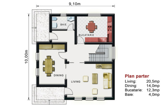 Astfel, la parter, în zona intrării, există un grup sanitar de 4 mp, iar mai departe se accede într-un hol din care se face distribuția atât către etaj, cât și către bucătărie, living și dining. Aceste spații sunt orientate unele către altele în scopul unei bune comunicări, care să susțină activitățile zilnice ale familiei. Bucătăria, cu o suprafață de 12,3 mp, oferă un spațiu generos pentru pregătirea și servirea mesei, având capacitatea de a suporta toate dotările necesare. Livingul se conturează ca o prelungire a holului, fiind delimitat de acesta din urma prin uși glisante și dispune de un spațiu de 20,5 mp, iluminat natural prin intermediul a 3 ferestre dispuse lateral. Diningul de 14 mp, aflat într-o strânsă legătură cu livingul, își păstrează totuși individualitatea prin intermediul ușilor culisante, dar și prin faptul că poate fi accesat din hol, precum un spațiu distinct. Acesta își exprimă prezența și în linia fațadei principale, ocupând un spațiu privilegiat, aflat în concordanță cu impontanța pe care și-o asumă.